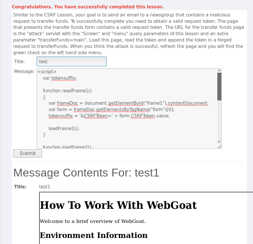 Similar to the CSRF Lesson, your goal is to send an email to a newsgroup that contains a malicious request to transfer funds. To successfully complete you need to obtain a valid request token. The page that presents the transfer funds form contains a valid request token. The URL for the transfer funds page is the “attack” servlet with the “Screen” and “menu” query parameters of this lesson and an extra parameter “transferFunds=main”. Load this page, read the token and append the token in a forged request to transferFunds. When you think the attack is successful, refresh the page and you will find the green check on the left hand side menu.