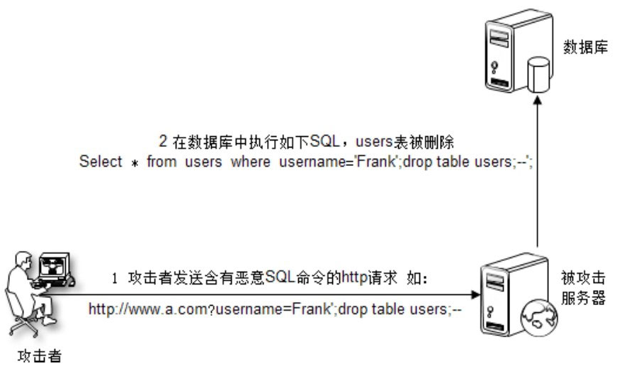 SQL注入攻击:攻击者在HTTP请求中注入恶意SQL命令(drop tableusers;),服务器用请求参数构造数据库SQL命令时,恶意SQL被一起构造,并在数据库中执行。
