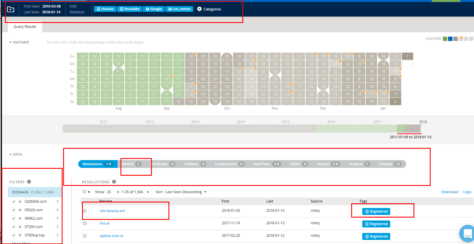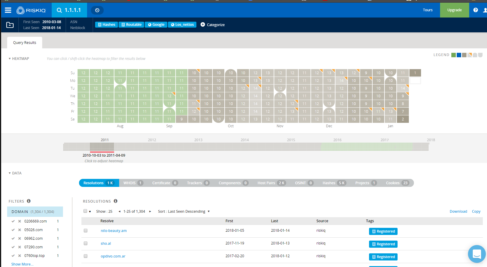 2、简介:常用来搜索IP、Domain、URL、whois信息、ipwhois信息等,是一个存储数量比较全面,信息量较大,而且可以和时间关联分析。实现这些维度的互查反查是很重要的一个功能。需要注册哦。