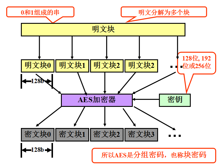 加密流程 明文分解为大小为128bit小块(明文小块大小小于128bit时,需要对这个明文小块进行填充操作)-》明文小块放入AES加密器各自生成密文块