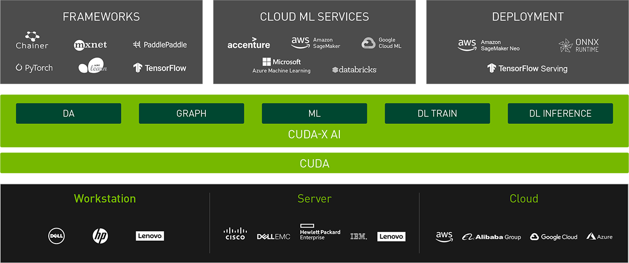 CUDA-X AI 随处可得。它的软件加速库集成到所有深度学习框架(包括 TensorFlow、PyTorch 和 MXNet)和常用的数据科学软件(例如 RAPIDS)中。这些库是领先的云平台(包括 AWS、Microsoft Azure 和 Google Cloud)的一部分,而且可以通过 NGC 网站逐个地或作为容器化的软件栈免费下载。CUDA-X AI 库可以部署到多种设备内的 NVIDIA GPU 上,其中包括台式机、工作站、服务器、云计算和物联网 (IoT) 设备。无论开发新应用程序,还是加快现有应用程序的运行速度,CUDA-X AI 都能提供极为高效和有效的前路。