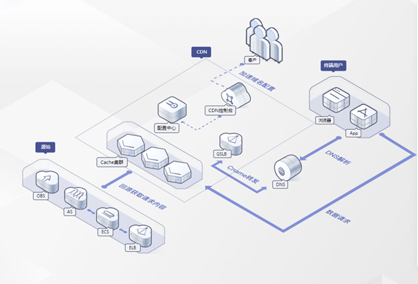 在网络加速方面,华为云的CDN下载加速在静态网站加速上有就近分发处理的特性,根据iInternet中的网络构架,将用户”快递“到最近的节点位置上,从而为网络下载速度。