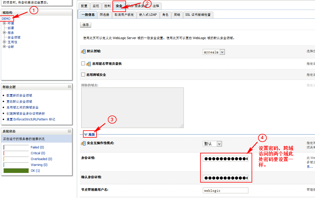 2.1、点左侧“域名”→点右侧“安全”→点“高级”→设置身份证明密码(注两个域的要设置相同的密码)→保存;
