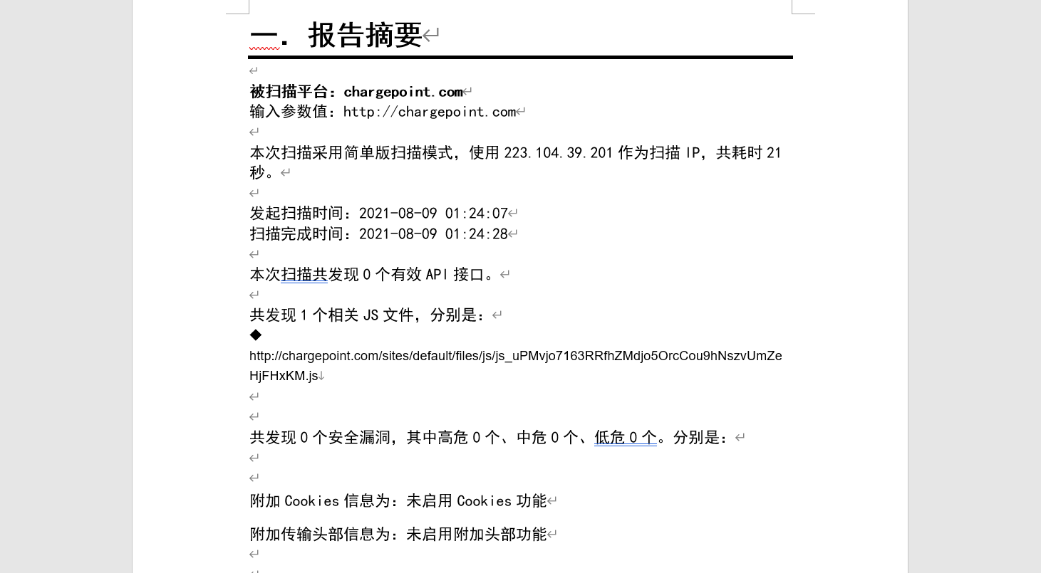 本工具支持自动模糊提取对应目标站点的API以及API对应的参数内容,并支持对:未授权访问、敏感信息泄露、CORS、SQL注入、水平越权、弱口令、任意文件上传七大漏洞进行模糊高效的快速检测。在扫描结束之后,本工具还支持自动生成扫描报告,您可以选择便于分析的HTML版本以及较为正规的doc、pdf、txt版本。