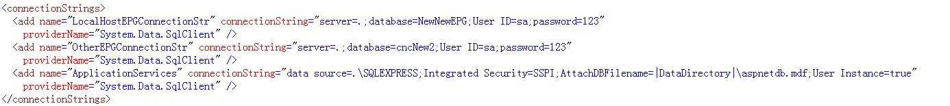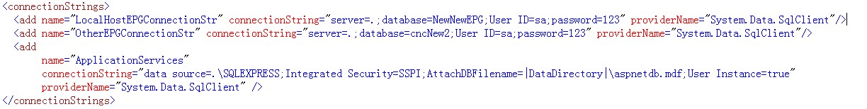 <add name=”LocalHostEPGConnectionStr” connectionString=”server=.;database=NewNewEPG;User ID=sa;password=123” providerName=”System.Data.SqlClient”/>
