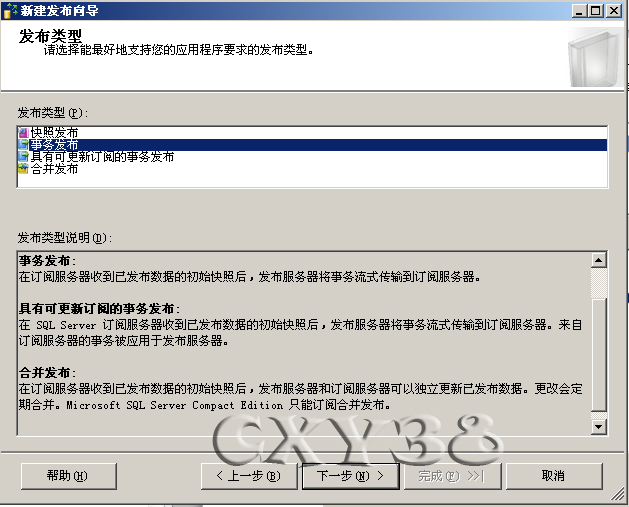在“发布数据库”框(图14)中,选择刚刚创建的数据库ReplA,然后单击“下一步”。出版类型”窗口(图15)允许您选择要使用的复制类型。选择“事务发布”,然后单击“下一步”。