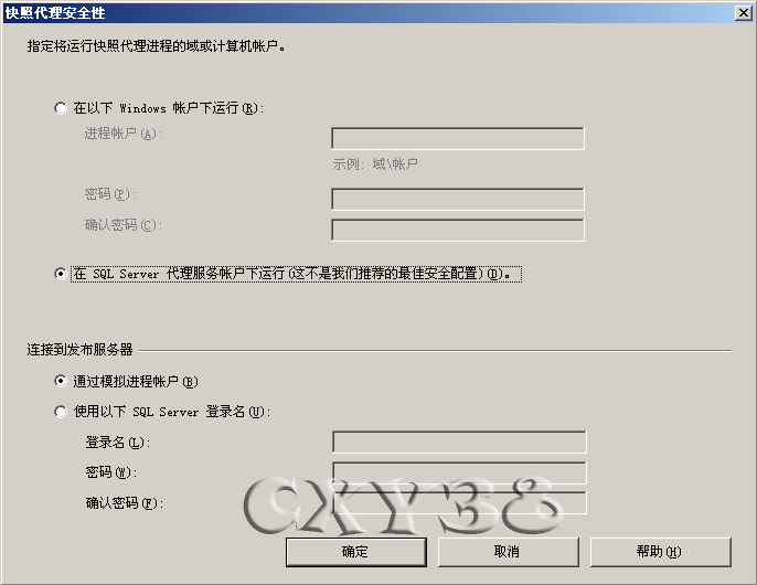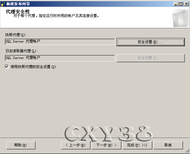接下来的三个窗口处理快照代理。在第一个窗口(图18)选择“立即创建快照”,然后单击“下一步”。在“代理安全性”窗口(图19)上,单击“安全设置”按钮,并在打开的表单上选择“在SQL Server代理服务帐户下运行”(图20)。