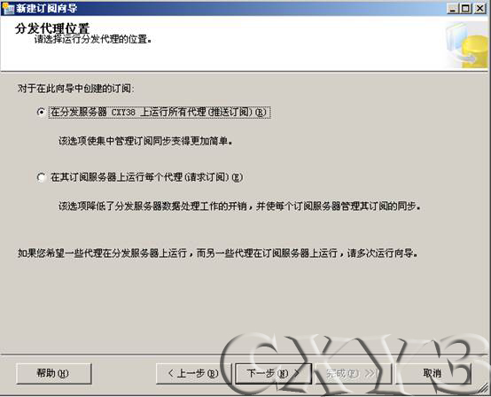 在“发布”表单(图26)中,选择刚刚创建的发布,然后单击“下一步”。“分发代理位置”窗口(图27)允许您在推送和拉送订阅之间进行选择。保留默认值,然后转到“订阅者”窗口(图28)。