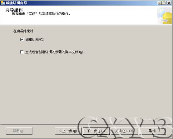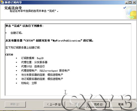 和前面一样,保留缺省值(创建订阅)并单击“下一步”将把您带到概要窗口(图34),其中列出将要执行的操作。单击“完成”以启动流程,并等待绿色成功标志出现在最终表单上(图35)。