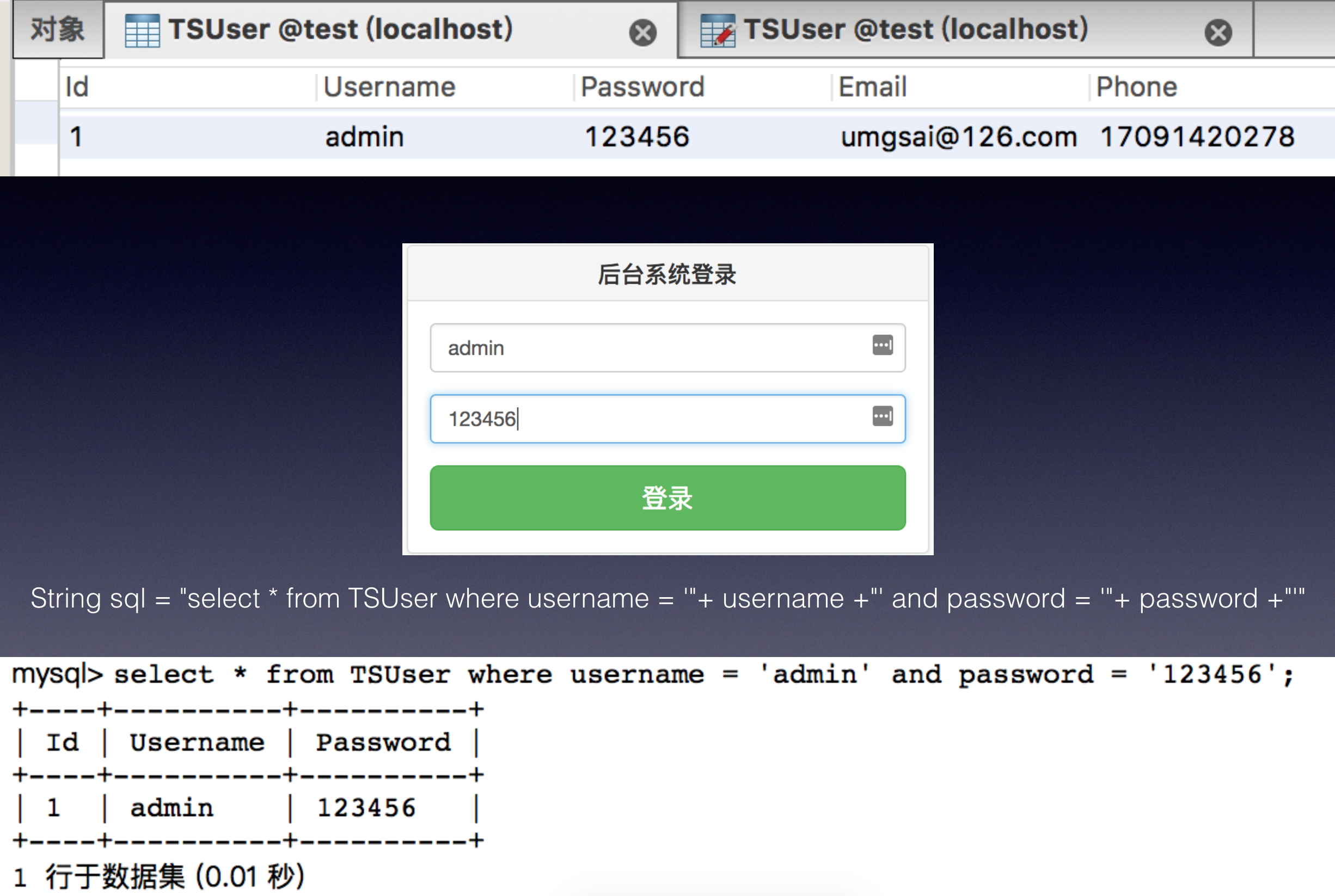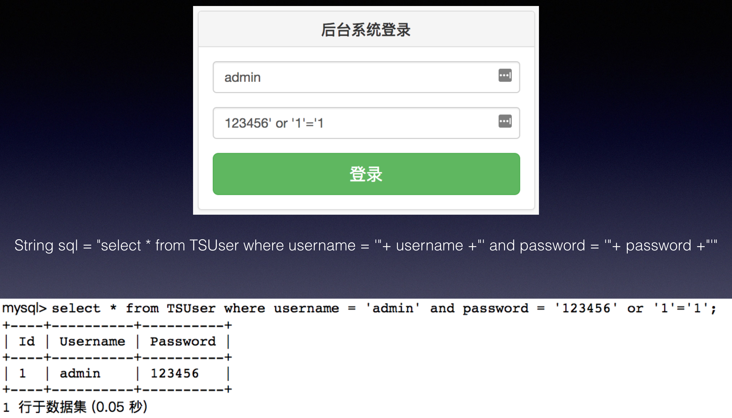 String sql = "select * from TSUser where username = ‘"+ username +"' and password = '"+ password +"'"; PreparedStatement ps = connection.prepareStatement(sql); ResultSet resultSet = ps.executeQuery();