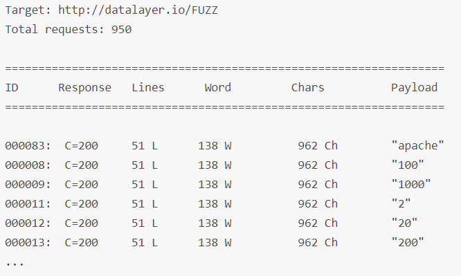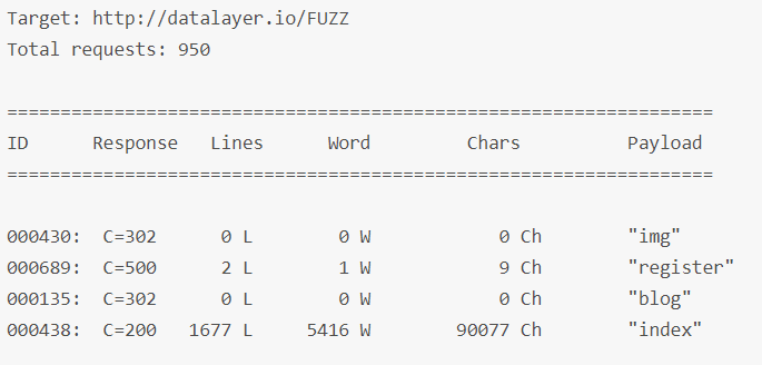 wfuzz -w /usr/share/wfuzz/wordlist/general/common.txt --hc 404 --hh 962 http://datalayer.io/FUZZ