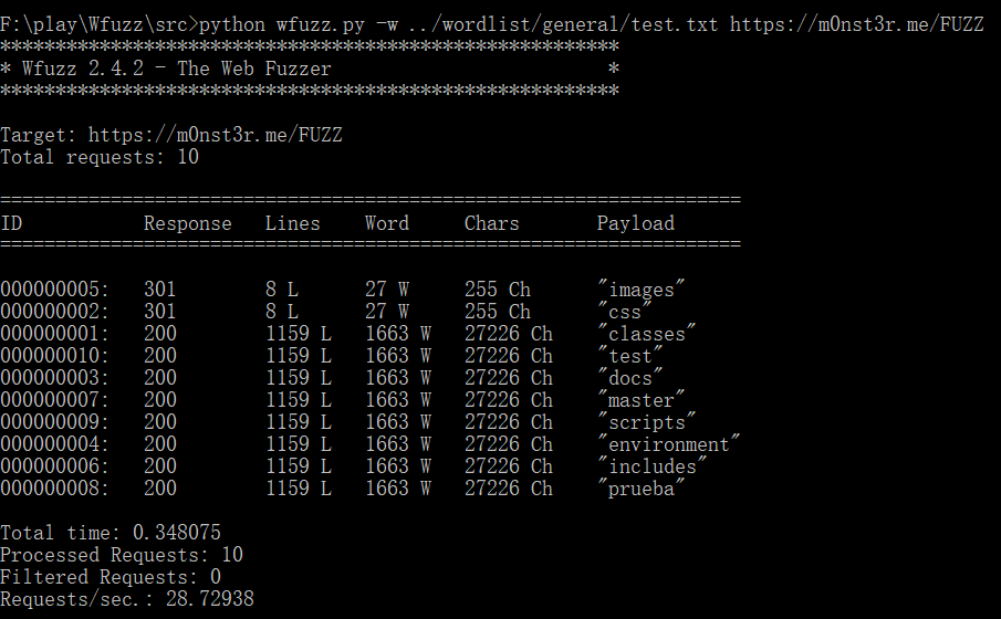 这条命令的意思应该很容易理解:首先解释下https://m0nst3r.me/FUZZ{this_is_404}的意思,这里代表wfuzz第一个请求是请求https://m0nst3r.me/this_is_404这个网址