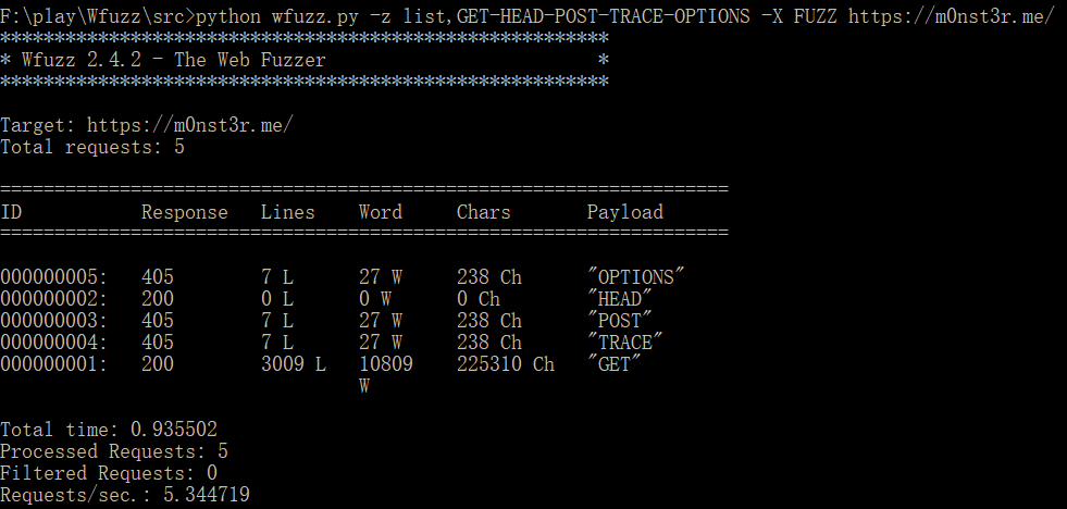wfuzz -z list,GET-HEAD-POST-TRACE-OPTIONS -X FUZZ http://testphp.vulnweb.com/