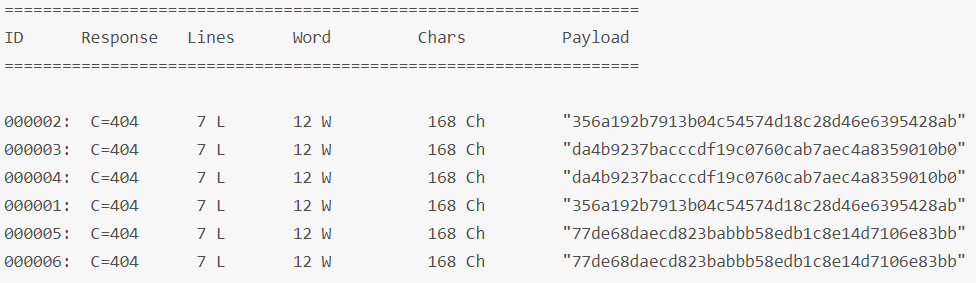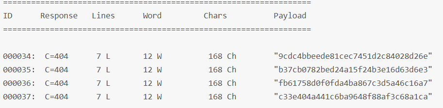 通过–hc,–hl,–hw,–hh参数可以隐藏某些HTTP响应。隐藏无法找到的页面的响应如下: