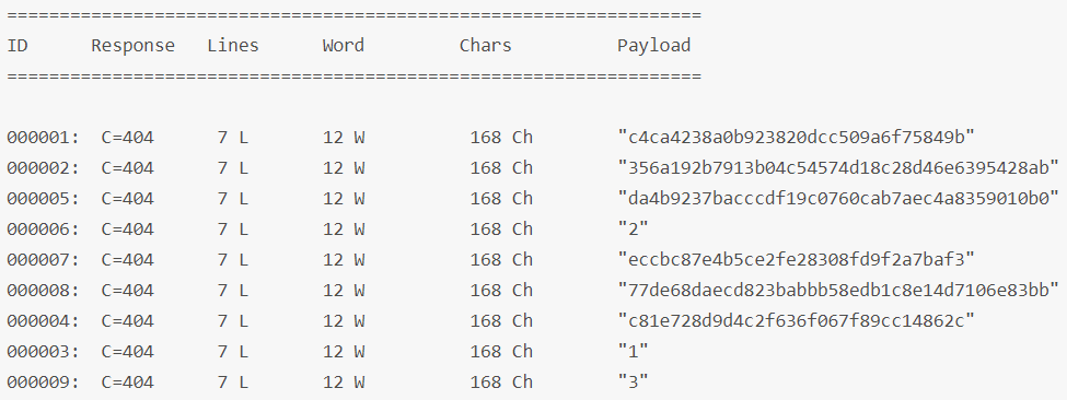 wfuzz -z list,1-2-3,md5-sha1-none http://testphp.vulnweb.com/FUZZ