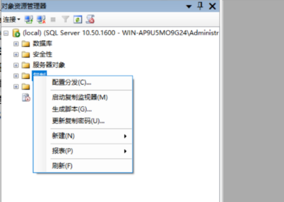 连接到服务器后,右键单击服务器下的“复制”文件夹,然后选择“配置分发”,如图1所示。