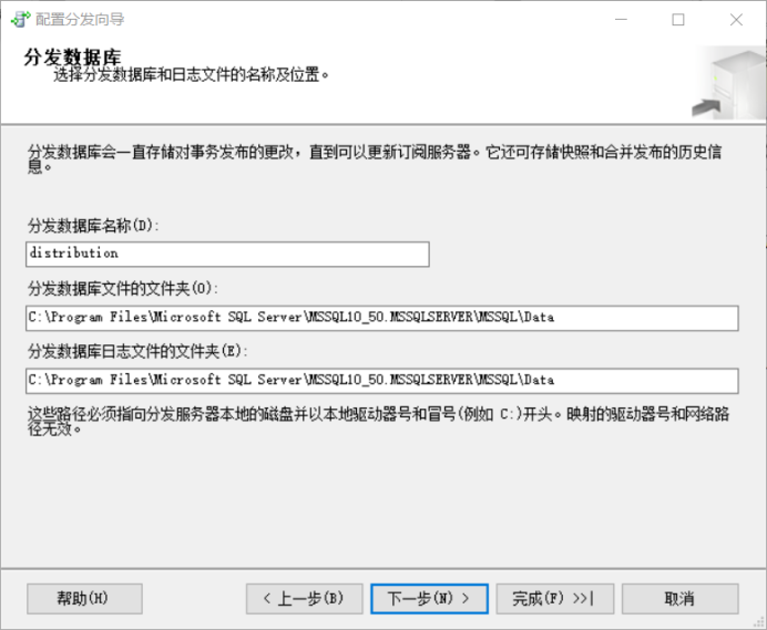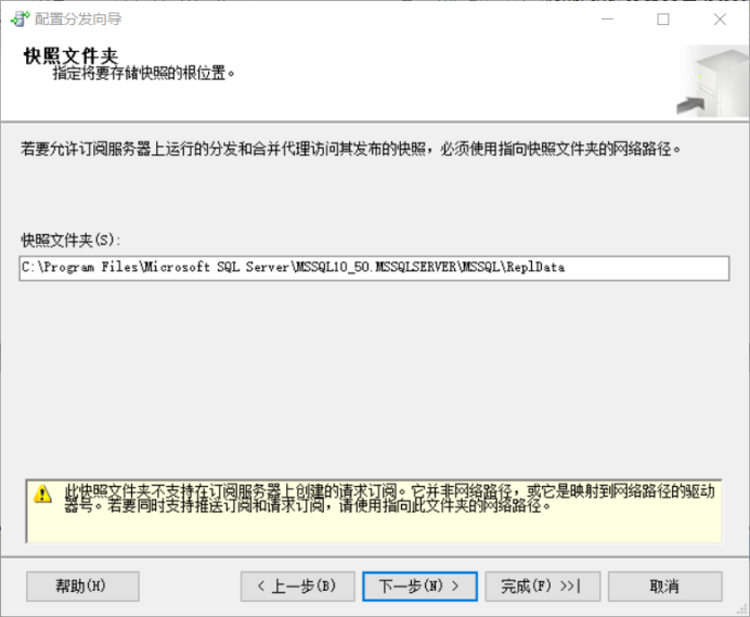 快照文件夹可以是计算机上或网络中的任何位置。在分销商上为其创建网络共享是有意义的。此示例使用“C:Program FilesMicrosoft SQL ServerMSSQL10_50 MSSQLSERVERMSSQLReplData”。