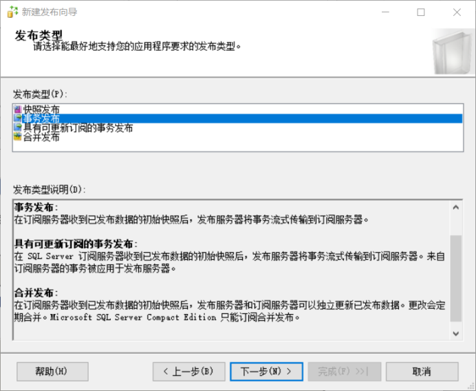 在“发布数据库”框(图14)中,选择刚刚创建的数据库ReplA,然后单击“下一步”。出版类型”窗口(图15)允许您选择要使用的复制类型。选择“事务发布”,然后单击“下一步”。