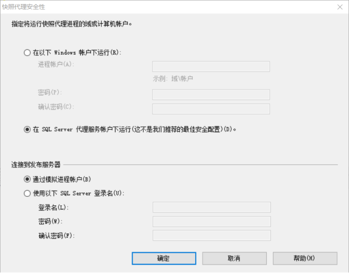 接下来的三个窗口处理快照代理。在第一个窗口(图18)选择“立即创建快照”,然后单击“下一步”。在“代理安全性”窗口(图19)上,单击“安全设置”按钮,并在打开的表单上选择“在SQL Server代理服务帐户下运行”(图20)。