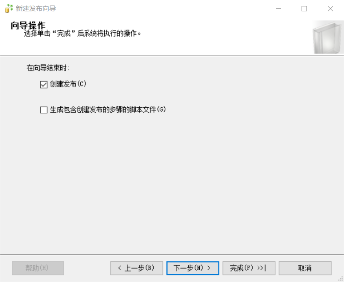 这将显示“向导操作”表单(图21),供您选择“创建发布”。最后一次单击“下一步”将带您到摘要窗口(图22)。