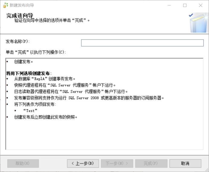 这里您需要为发布选择一个名称。在字段中写入“MyFirstPublication”,然后单击“完成”开始该过程。同样,最后一个窗口(图23)显示了流程完成时的进度信息和成功状态。