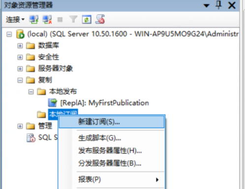 现在我们转到SSMS对象资源管理器,右击“本地订阅”,并在下拉菜单中选择“新建订阅”(图24)。