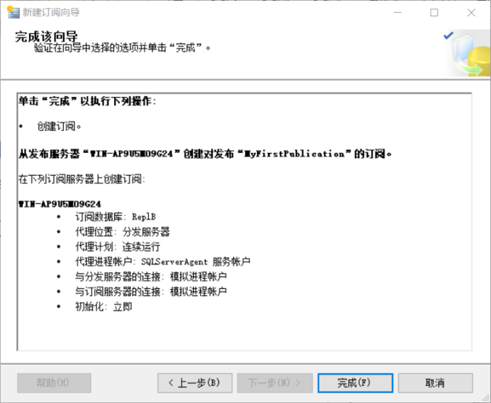 和前面一样,保留缺省值(创建订阅)并单击“下一步”将把您带到概要窗口(图34),其中列出将要执行的操作。单击“完成”以启动流程,并等待绿色成功标志出现在最终表单上(图35)。