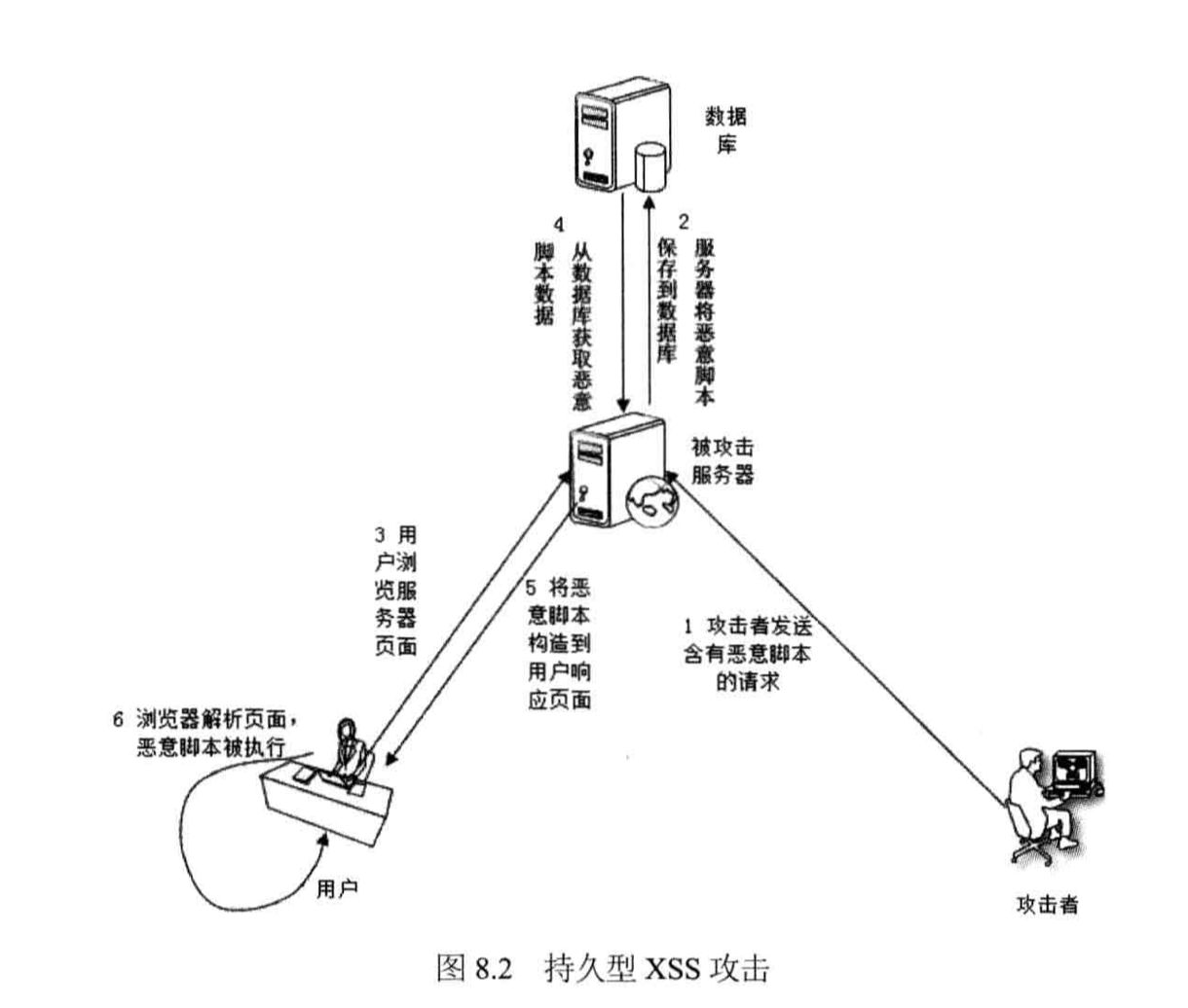 另一种XSS攻击是持久型XSS攻击,黑客提交包含有恶意脚本的请求,保存在被攻击的Web站点的数据库中,用户浏览网页时,恶意脚本被包含在正常页面中,达到攻击的目的,如下图所示。此种攻击经常使用在论坛,博客等Web应用中。