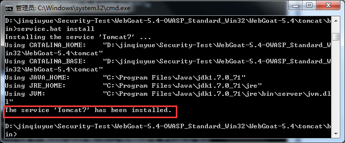a.) 由于不是使用安装版的tomcat,不能在服务中打开tomcat,所以要进入cmd,cd进入tomcat的bin目录,输入service.bat install如图所示,第一次安装会提示已被安装。