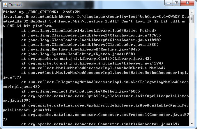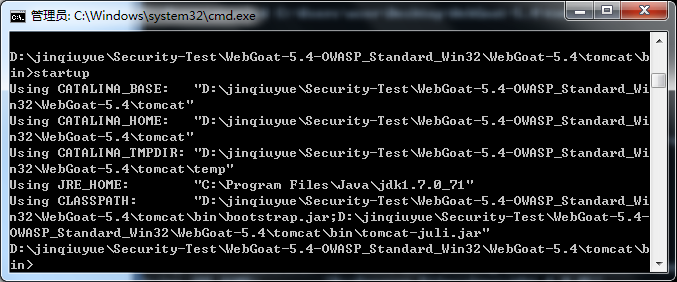 c.) 进入webgoat文件夹,打开webgoat_8080.bat,tomcat默认是占用8080端口。如果以上的操作都没有出错,这个时候会弹出一个tomcat窗口,表示服务已启动。
