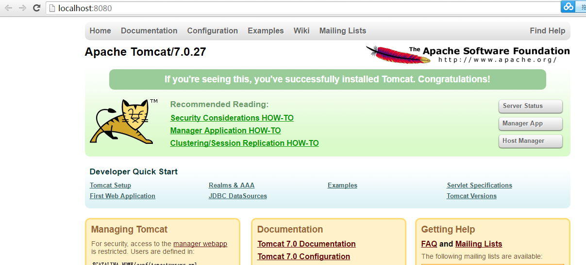 a.) 打开浏览器,输入http://localhost:8080/ ,出现以下页面表示tomcat服务已经成功启动