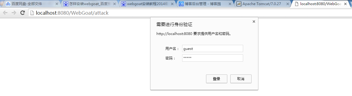 b.) 输入http://localhost:8080/WebGoat/attack 会出现身份验证,不同系统和浏览器弹出的框的样式很不一样,但是身份验证是一样的。用户名和密码都是guest,如图所示: