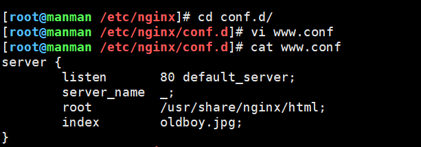 将路径切换到www.conf文件的目录下面,将文件进行编辑,指定那张图片做首页信息,然后排错重启