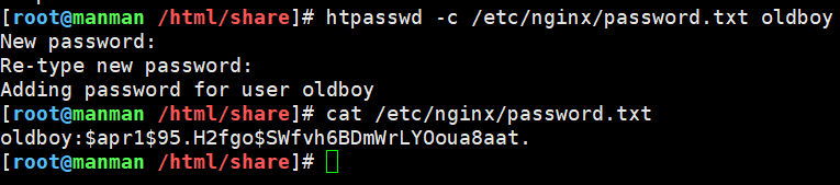 oldboy123 --- 存储服务端 数据库 xxxausdtiasdtuiasd 密文信息 yum install -y httpd-tools htpasswd -c /etc/nginx/password.txt oldboy --- 设置用户密文密码信息