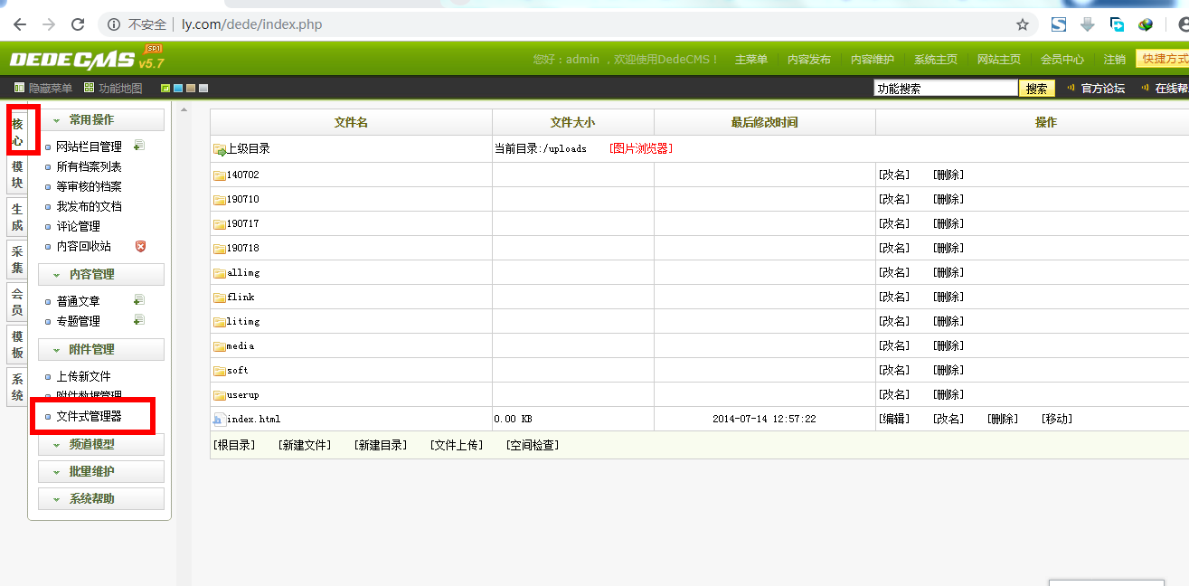 删除成功后基本不用管理哪些了,当然也可以继续按着目录里面的来进行逐个删除,但是我们dede这个目录我们还是需要将它的名字给改掉的,使用这个目录相对来说还是比较安全的,因为dede这个目录名称不改变,黑阔们就好容易发现我们的后台地址,因此我们需要将我们的dede目录改写成一个复杂点名称的目录来逃避黑阔们的检测~~!