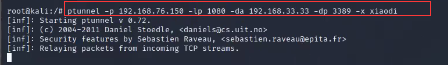 <3>在kali上执行以下命令,将webserver作为跳板,转发目标主机3389请求数据给本地1080端口