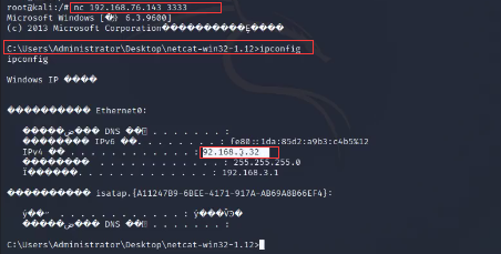 <3>在kali上执行以下命令,连接Webserver的3333端口,成功反弹shell,连接到Sqlserver。