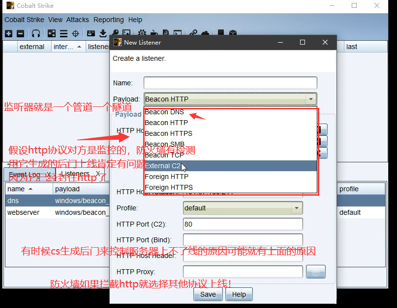 我们在生成监听器的时候有个payload,可以选择不同的协议。网上还有插件,还可以有很多其他协议。