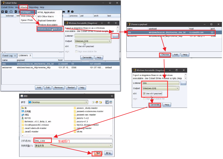 <5>生成后门,attacks–>packages–>windows executable(s)–>listener选择dns上线,勾选–>选择后门生成位置–>生成后门(dns_x.exe)
