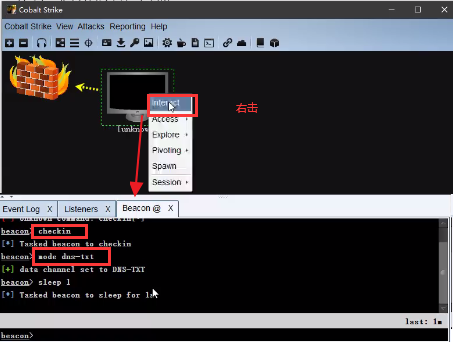<8>右击unknown主机,选择interact,启用命令。执行以下命令,等待一会儿就会上线成功