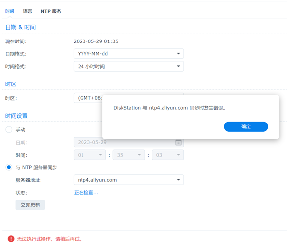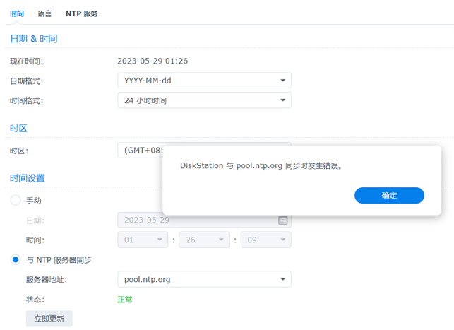 这两天为了跑Pcdn搞了个J1900的软路由,装上了ikuai。打开群晖一看,系统时间居然比当前时间快了一天,手动进行NTP同步结果返回以下信息: