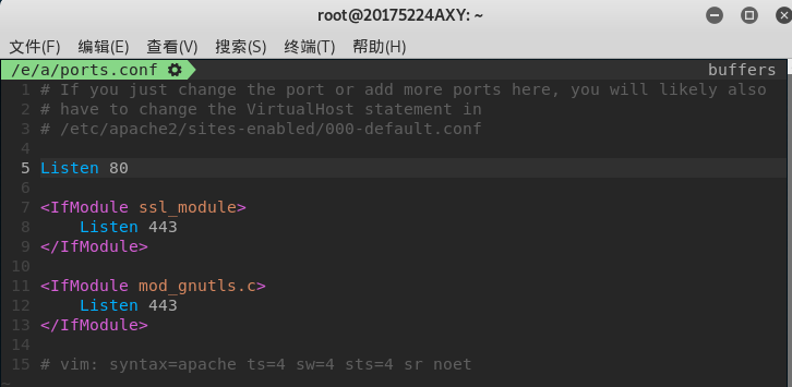 由于要将钓鱼网站挂在本机的http服务下,所以需要将SET工具的访问端口改为默认的80端口。使用sudo vi /etc/apache2/ports.conf命令修改Apache的端口文件,将端口改为80,如下图所示