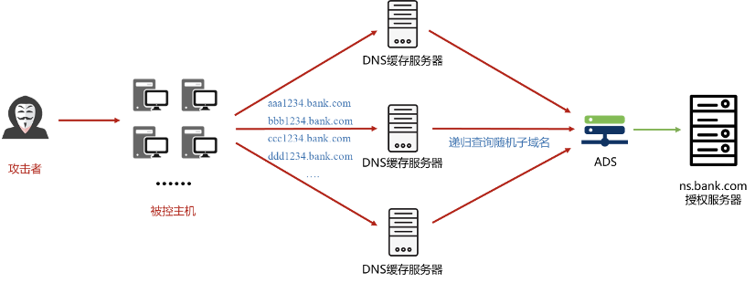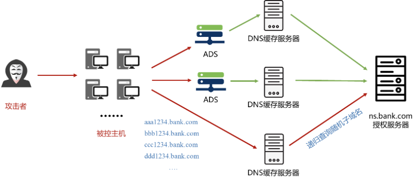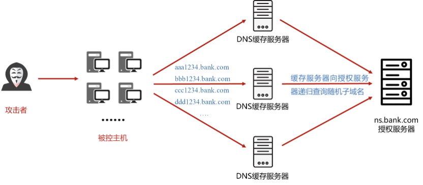 攻击者企图攻击某银行的授权服务器ns.bank.com,攻击者构造大量的虚假子域名请求,例如: