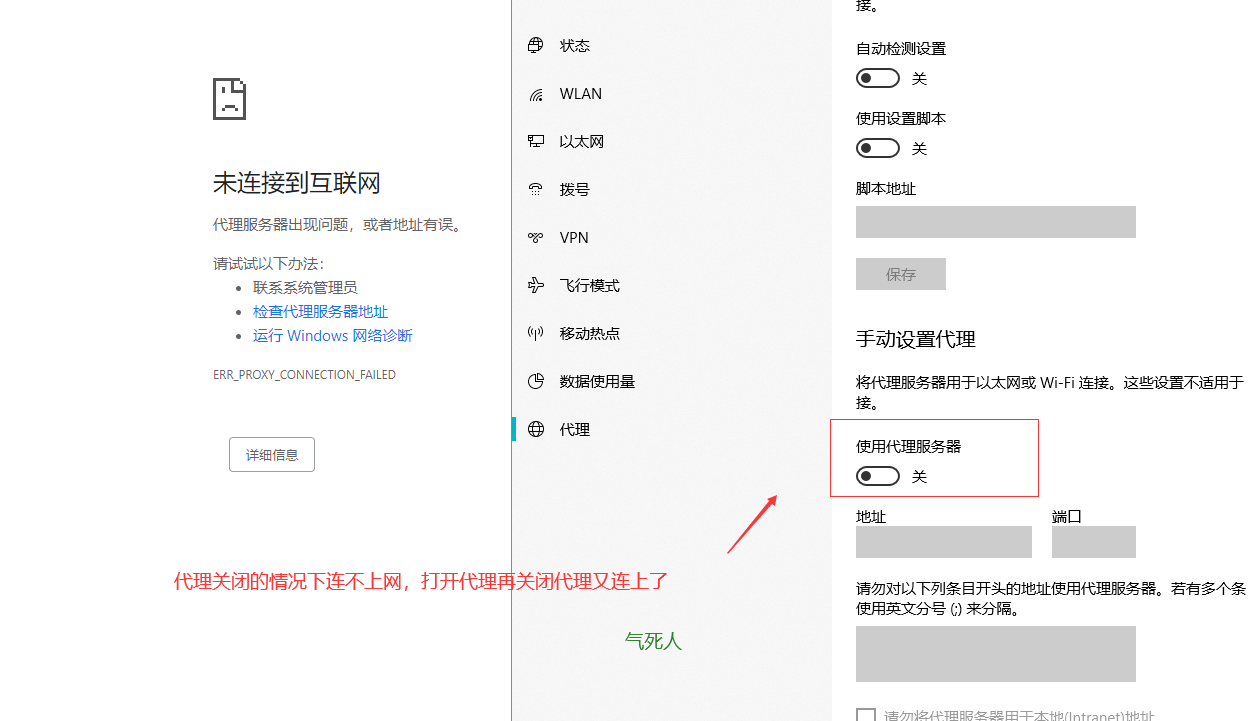 这几天很困扰,win10系统的代理总是自动打开,导致上网的时候突然连不上网,有时代理开关处于关闭状态也是一样,提示连不上网,但是只要把手动代理开关打开再关闭,又能连上了。每隔十几分钟就来一次,如此反复,各种方法都试了,改hosts,改注册表,改IE,改DNS,还没解决。真是气死我了。