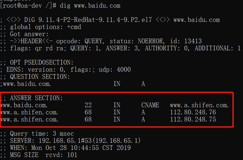 我们可以在linux系统中用dig命令来查看。如果是centos系统没有该命令可以使用 yum install bind-utils 来安装。
