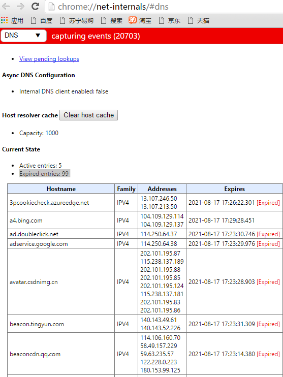 Chrome 为了加快网页的加载速度,会对 DNS 进行缓存以节省 DNS 解析的时间,上图就缓存了很多DNS信息。