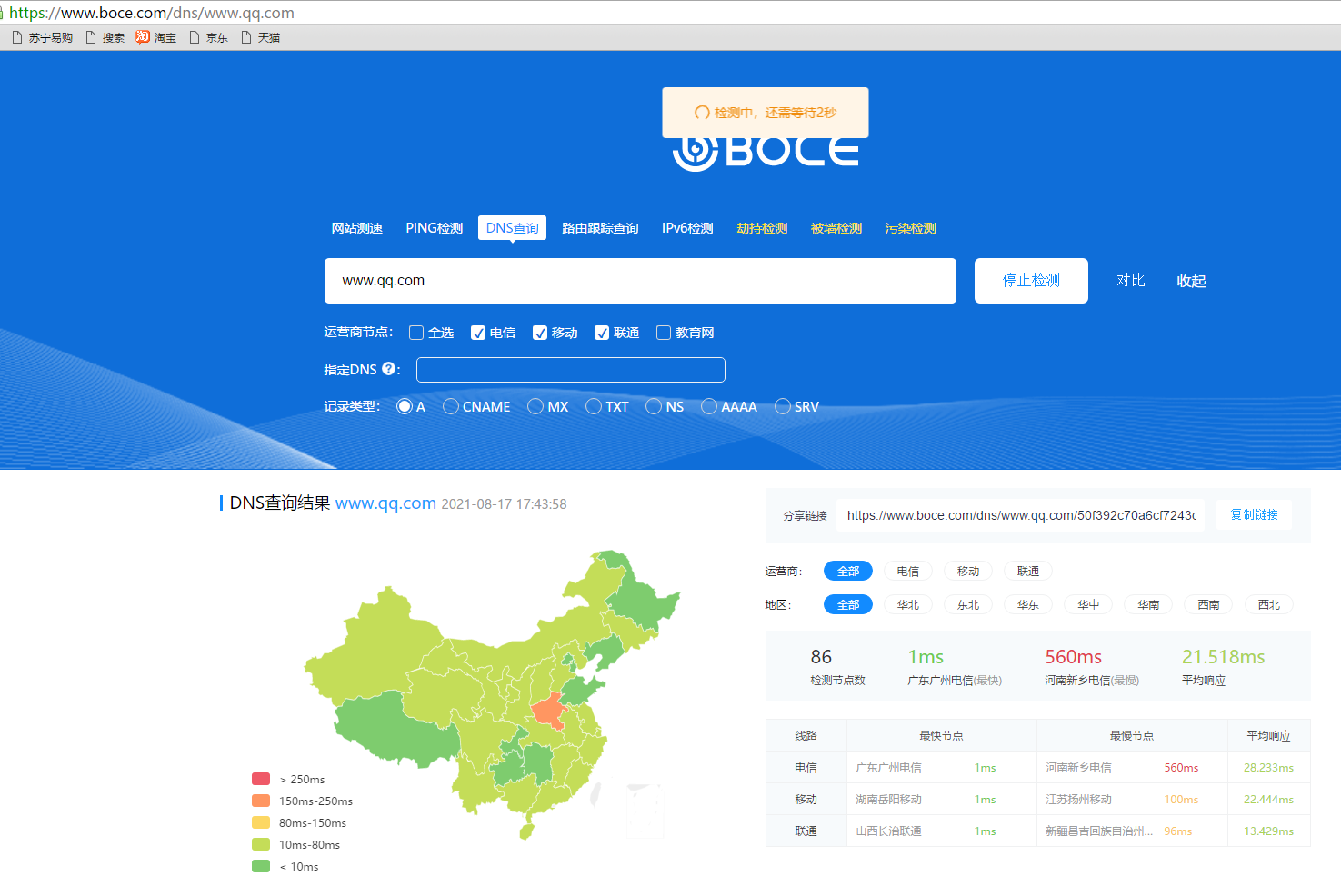 还有的时候为了了解全国各个地区对域名的解析速度,有个网站可以提供监测服务:https://www.boce.com