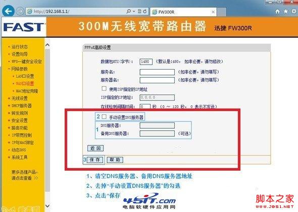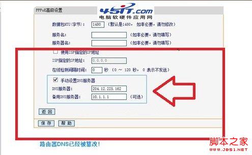 4、那么该如何操作呢?放大很简单,我们只需将下面的DNS服务器与备用DNS服务器地址改成正常的,当然你也可以将其去掉,然后将“手动设置DNS服务器”前面的勾去掉,然后点击下方的保存即可,如下图: